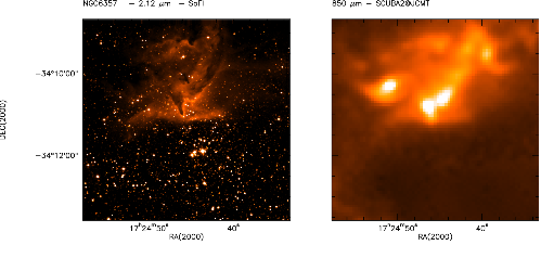 stars are evident in the submm image. The feedback from the high-mass stars of Pis 24 is eroding the molecular gas in the north, but may